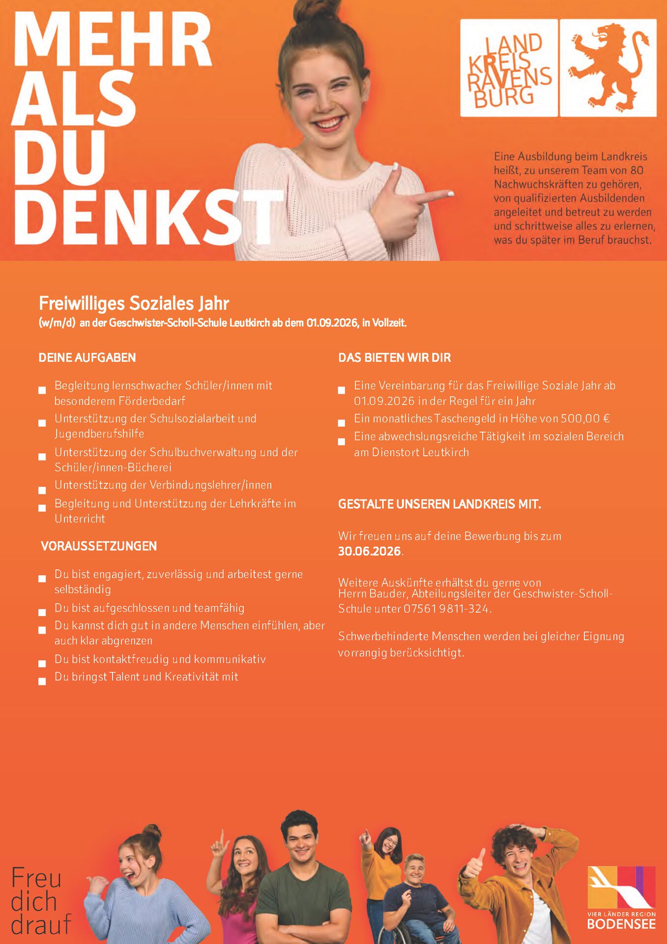 FREIWILLIGES SOZIALES JAHR an der Geschwister-Scholl-Schule Leutkirch ab dem 01.09.2026, in Vollzeit. Bewerbung noch möglich!